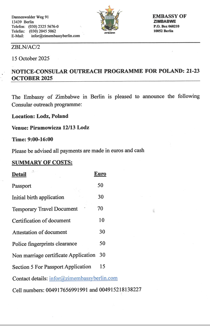 NOTICE: RESUMPTION OF PASSPORT APPLICATION SERVICE26 September 2025 Poland Consular Visit: 21-23 October 2025 Share0 emmyshutu@gmail.com Related posts26 September 2025NOTICE: RESUMPTION OF PASSPORT APPLICATION SERVICERead more Comments are closed.